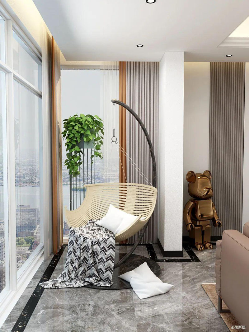 阳台上大面积的落地窗,将顶层的位置优势完美展现,视野与采光都得到了保证,站在窗边就能俯瞰莅临江湖的城市美景。阳台上留一隅悠闲的小角落,置入竹编状的吊椅,闲暇时光都可以在这度过。