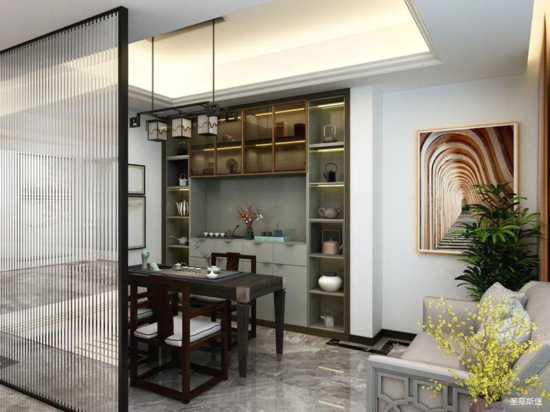 客厅与茶室之间以长虹玻璃隔断,有效的划分功能区,为空间展现一番“犹抱琵琶半遮面”的东方意境美。茶室将意式极简与传统风格糅合,摒弃繁杂、刻板的形式,以含蓄的现代极简诠释着东方美学,展现着传统的待客之道。实木与钨金金属质感碰撞,有棱有角,高级感顷刻得到了升华。